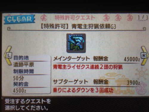 こんばんわ♪ 独歩です。 常に3DSを持ち歩いていたのが功を奏し、 切らしていた二つ名の許可証がたまってきました 二つ名で最小金冠がまだなのは、矛砕、宝纏、青電主の3種。 青電主のみ、討伐数がまだ称号がもらえる30匹に届いていないので、 ひとまず…
