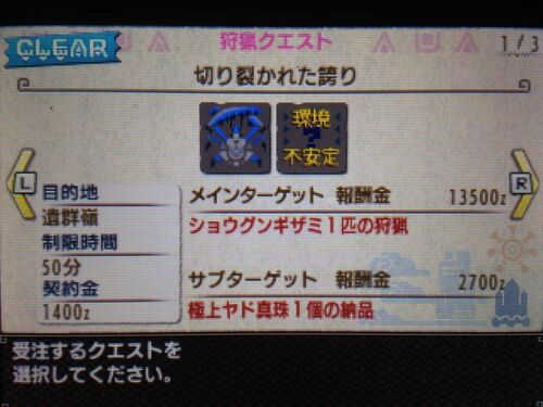 こんばんわ♪ 独歩です。 サイズ判断できるスキル、ないかなぁ(*´Д`) オトモの能力でもいいです。 カプコンさんお願いしますm(__)m ま、なんだかんだいっても残り一桁まできました。 弱そうなのから片づけいくか~ 【狙うクエスト】 ・G2「切り裂かれた誇…