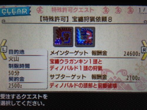 こんばんわ♪ 独歩です。 明日は午前中だけお休みをいただきました\(^o^)/ 今週は余裕だなぁ♪ うふふ~ 本日はグラビモスが調査対象になっていました。 そして、都合のいい複数クエを発見! 【狙うクエスト】 ・特殊許可「岩穿狩猟依頼G3」(岩穿&グラビ…